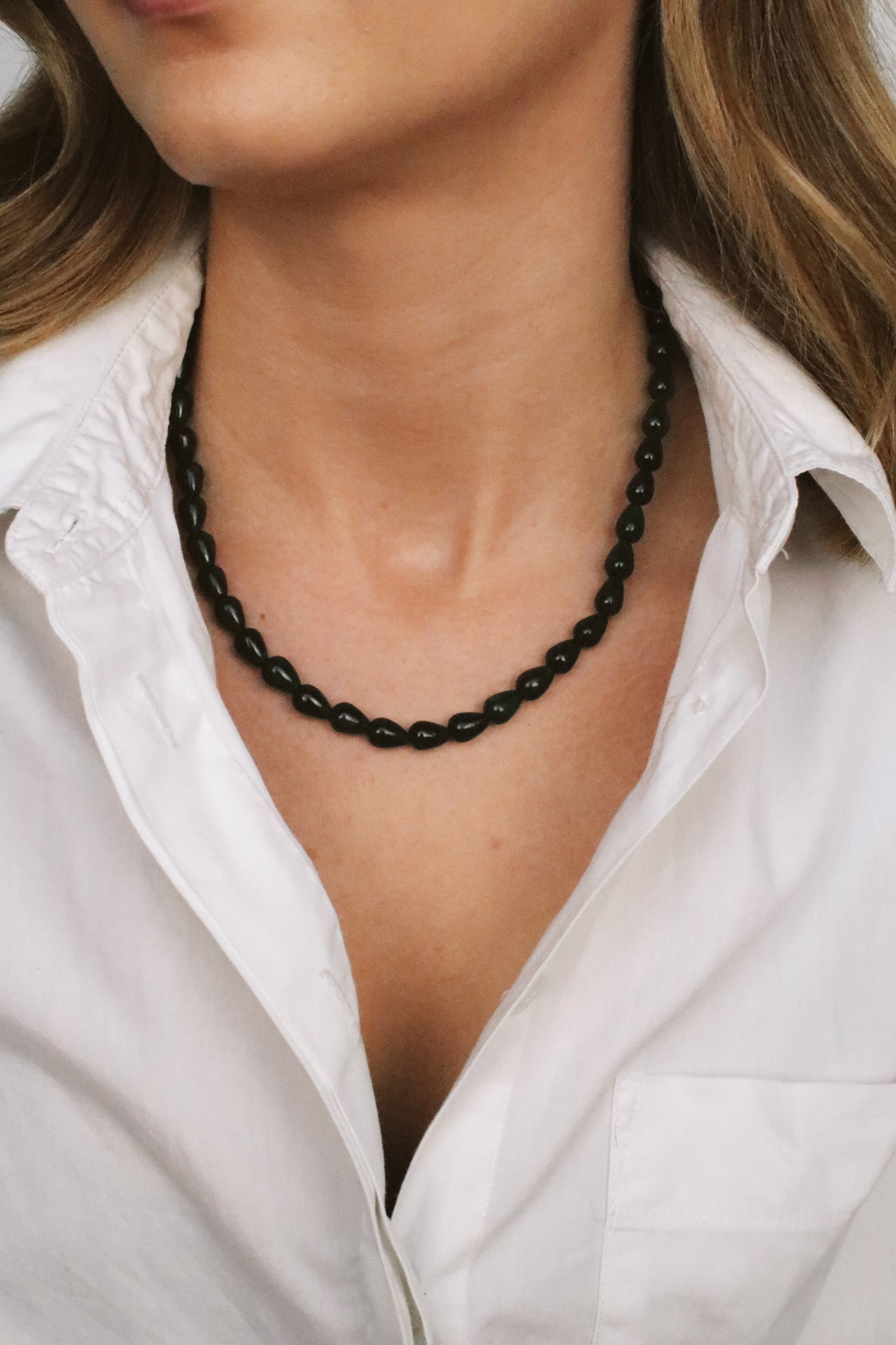 - Deep green teardrop beads with natural shine