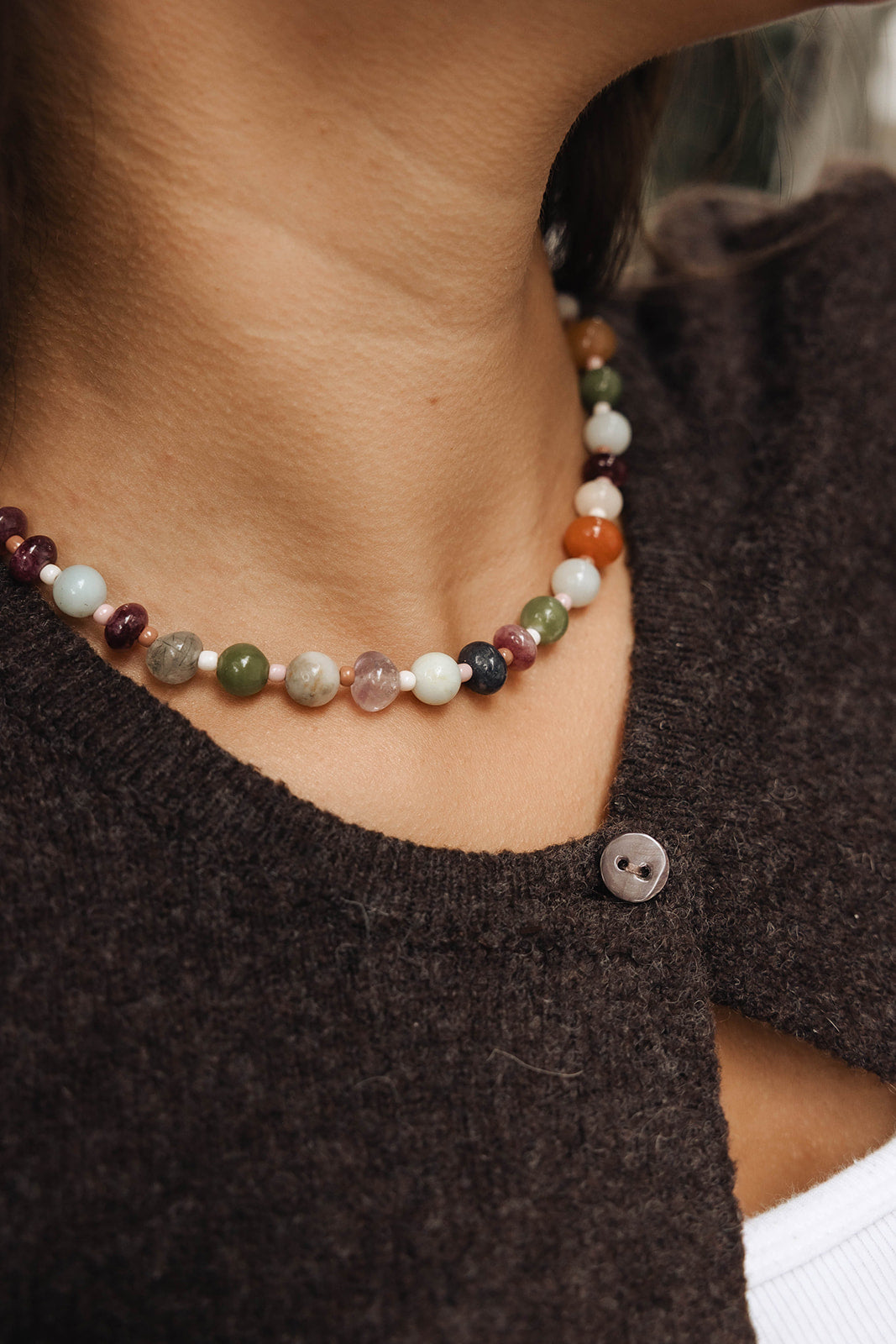 A colorful ode to fall. The Maple Necklace is hand-strung with multicolored gemstone beads, each one unique and glowing with warmth. Finished with a gold-filled lobster clasp and a 2-inch extender, this necklace captures the playful spirit of autumn mornings and the romance of heirloom keepsakes. Wear it solo for a pop of color or layer it with golden chains for a dreamy look.