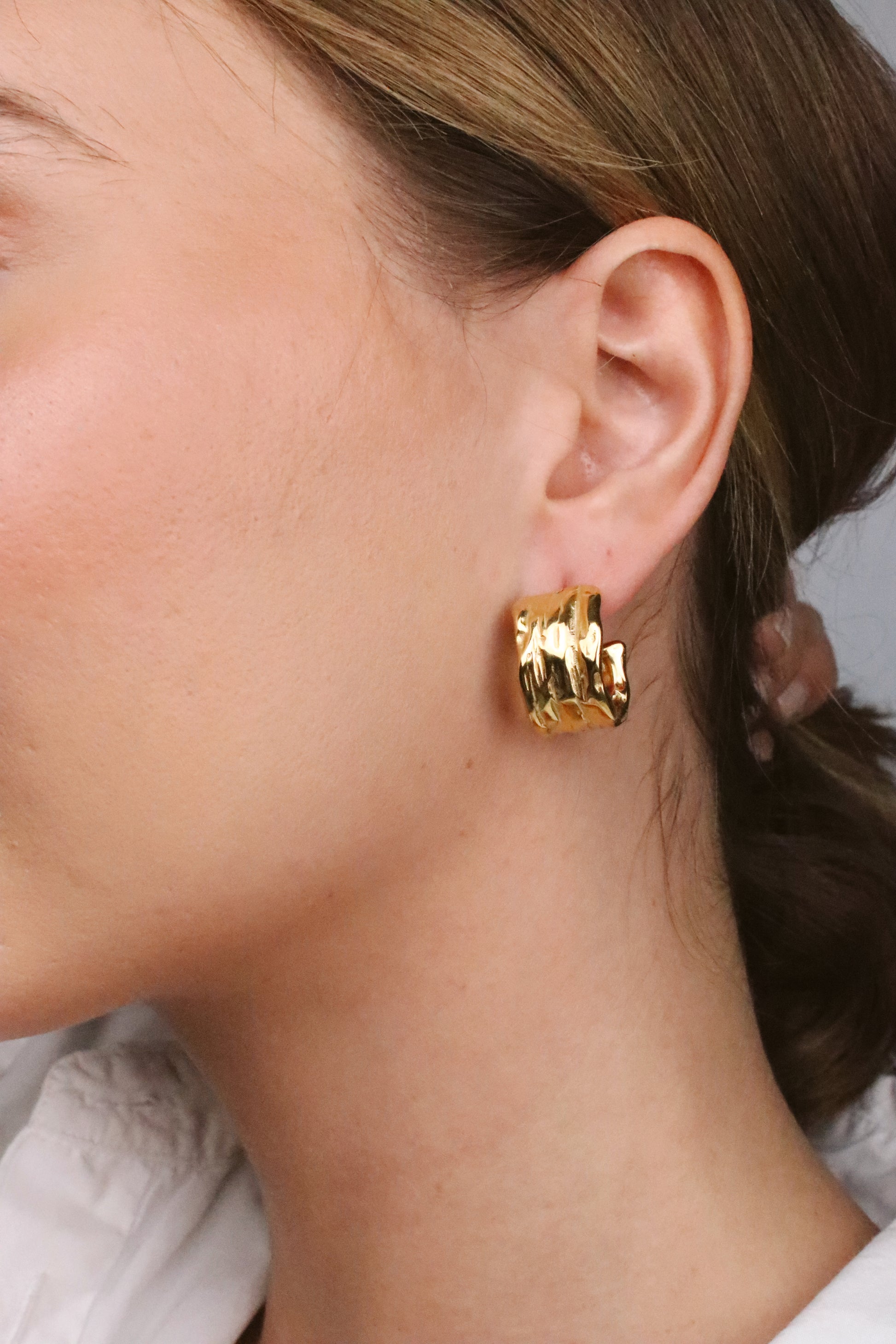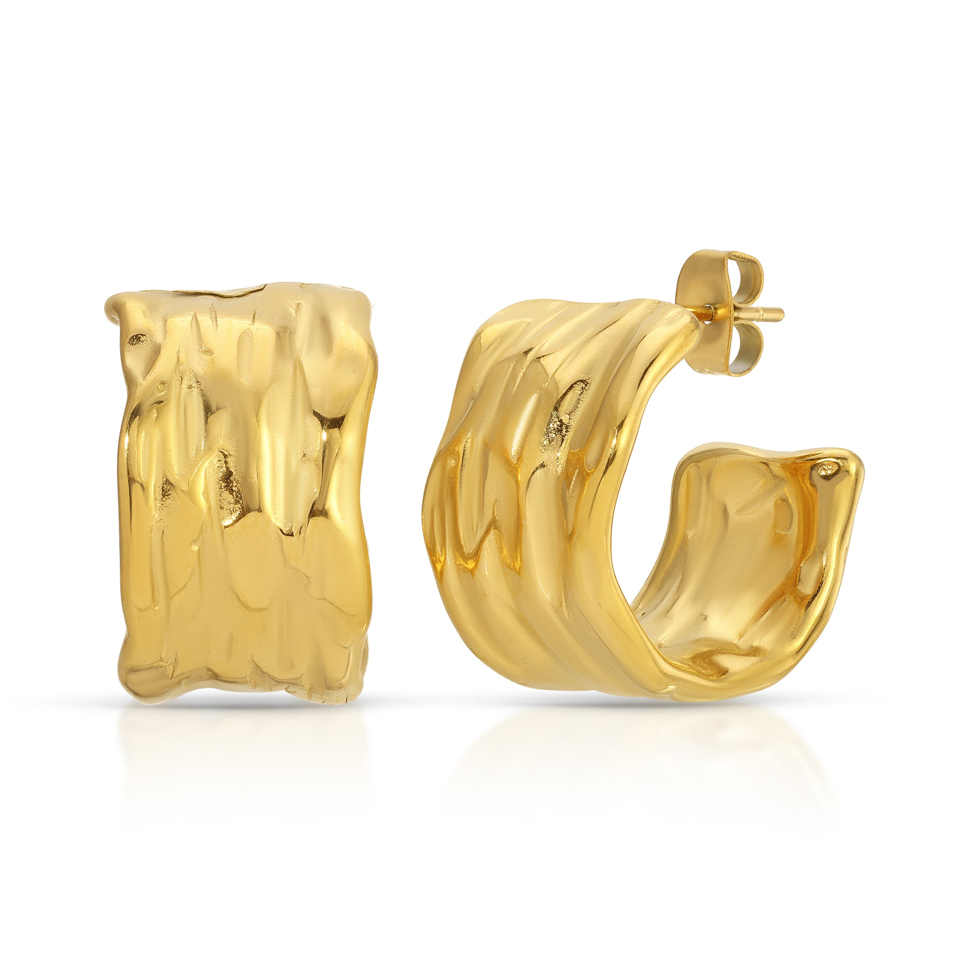 Bold, sculptural, and full of shine. The Molten Hoops feature a wavy, molten-gold texture that reflects the light beautifully and adds an instant statement to any look. Lightweight and easy to wear, they bring the perfect mix of modern edge and timeless gold.
